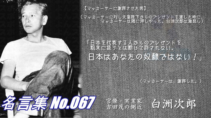 連絡用よんよん 名言集no 067 白洲次郎 マッカーサーに謝罪させた男 天皇陛下からのプレゼントを渡したときに マッカーサーは隅に 白洲は激怒した 日本を代表する人からのプレゼントを 粗末に扱うとは断じて許されない 日本はあなたの奴隷